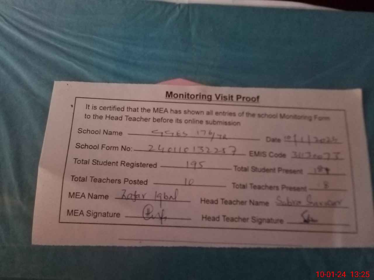 | Attendance Register | Head Teacher | MEA with School | Visit Proof |