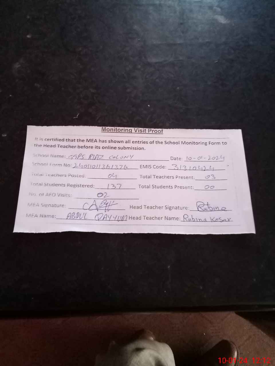 | EMIS Code: 31310424 | Name of School: GGPS RIAZ COLONY JETHA BHUTTA (After Noon) | |||