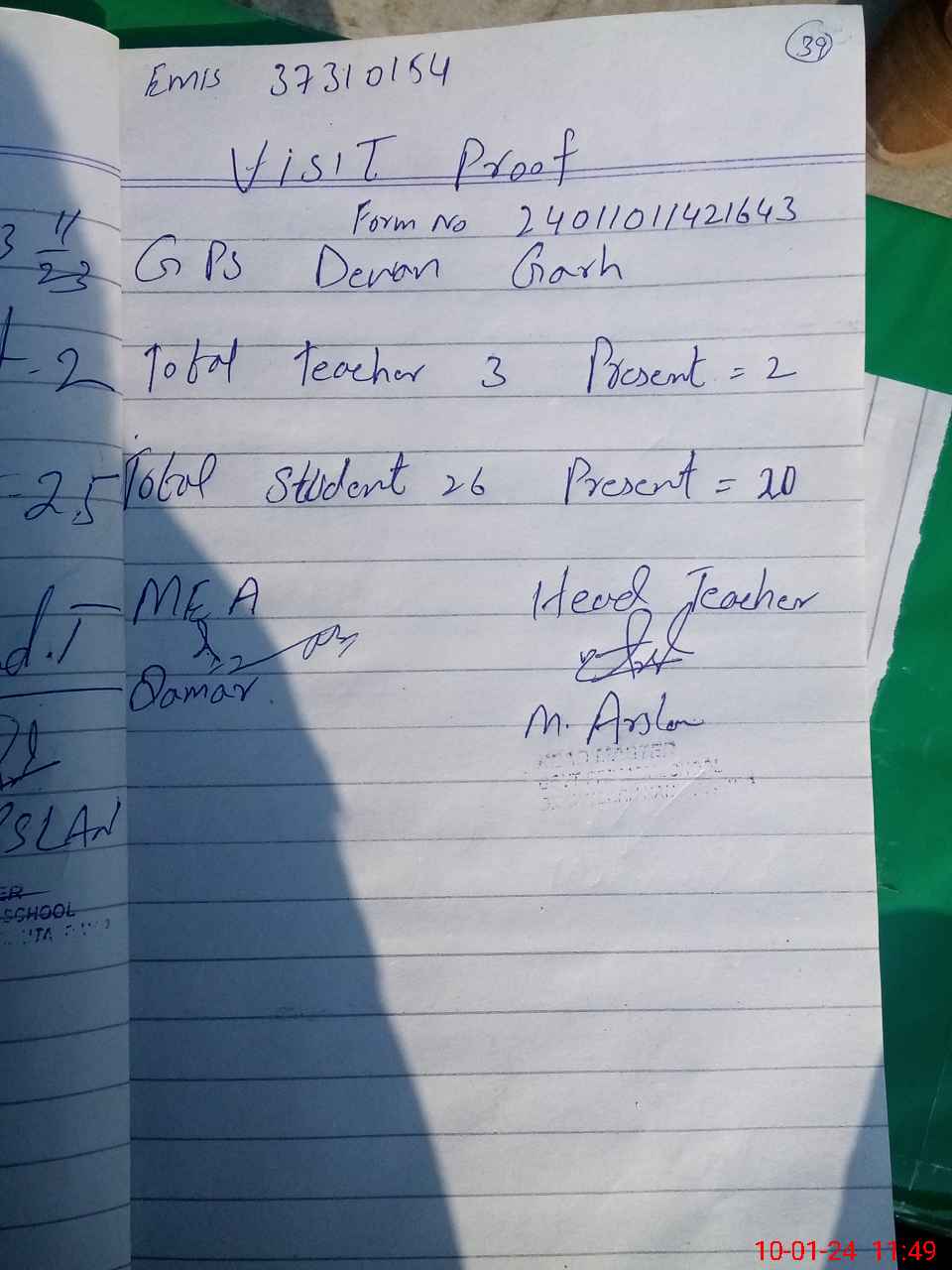 | Attendance Register | Head Teacher | MEA with School | Visit Proof |