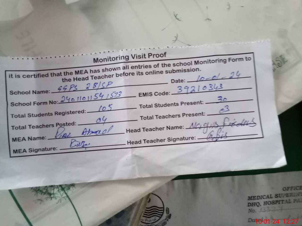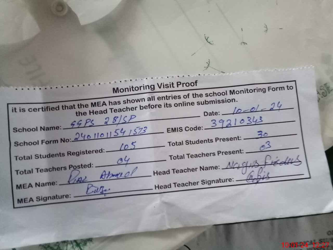 | Attendance Register | Head Teacher | MEA with School | Visit Proof |