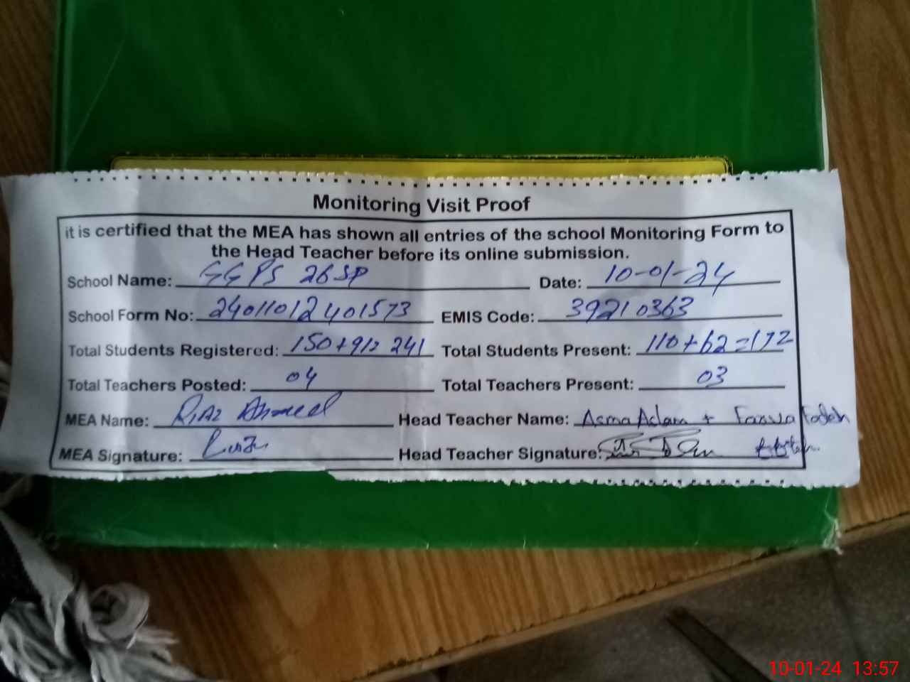 | Attendance Register | Head Teacher | MEA with School | Visit Proof |