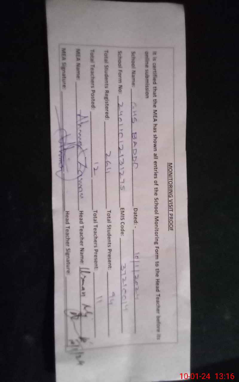 | Certified that this School was Inspected by the Undersigned MEA/DMO Today and the Information Stated Above is as Per Record. | |||||
