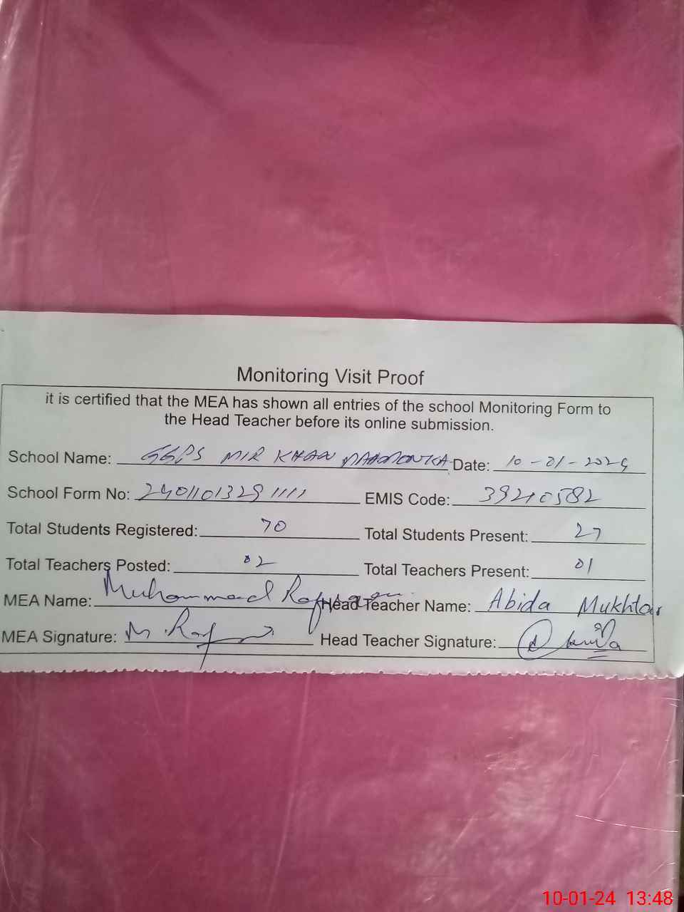 | Certified that this School was Inspected by the Undersigned MEA/DMO Today and the Information Stated Above is as Per Record. | |||||