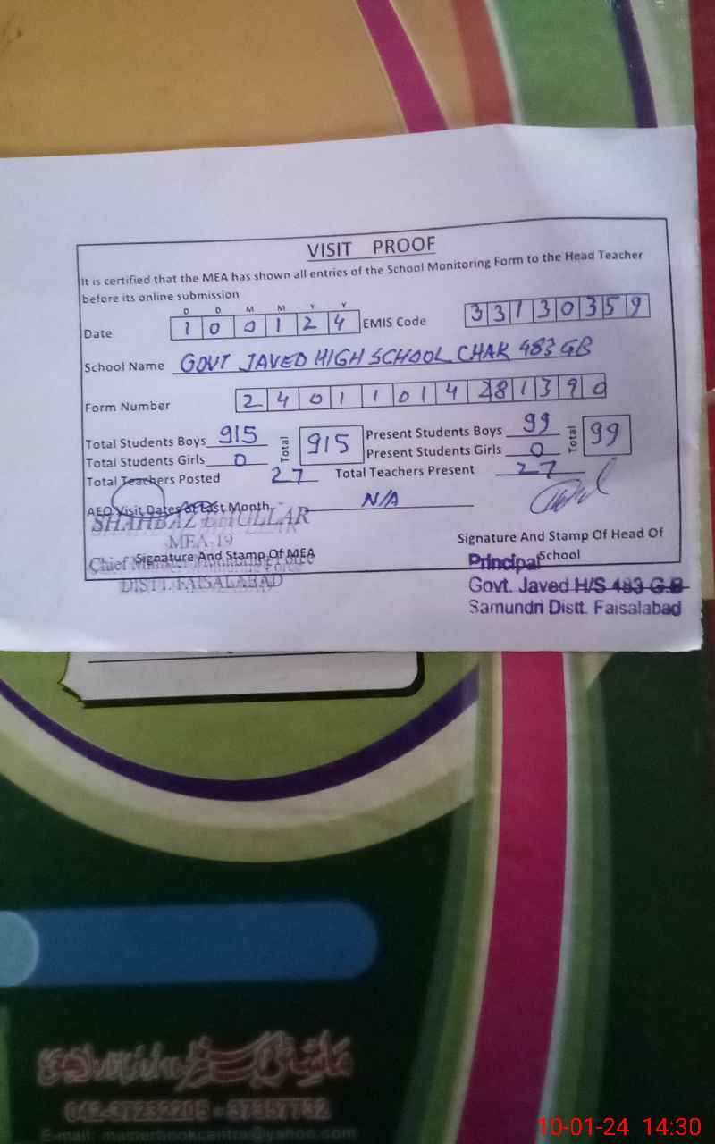 | EMIS Code: 33130359 | Name of School: GHS JAVAID CHAK 483 GB | |||