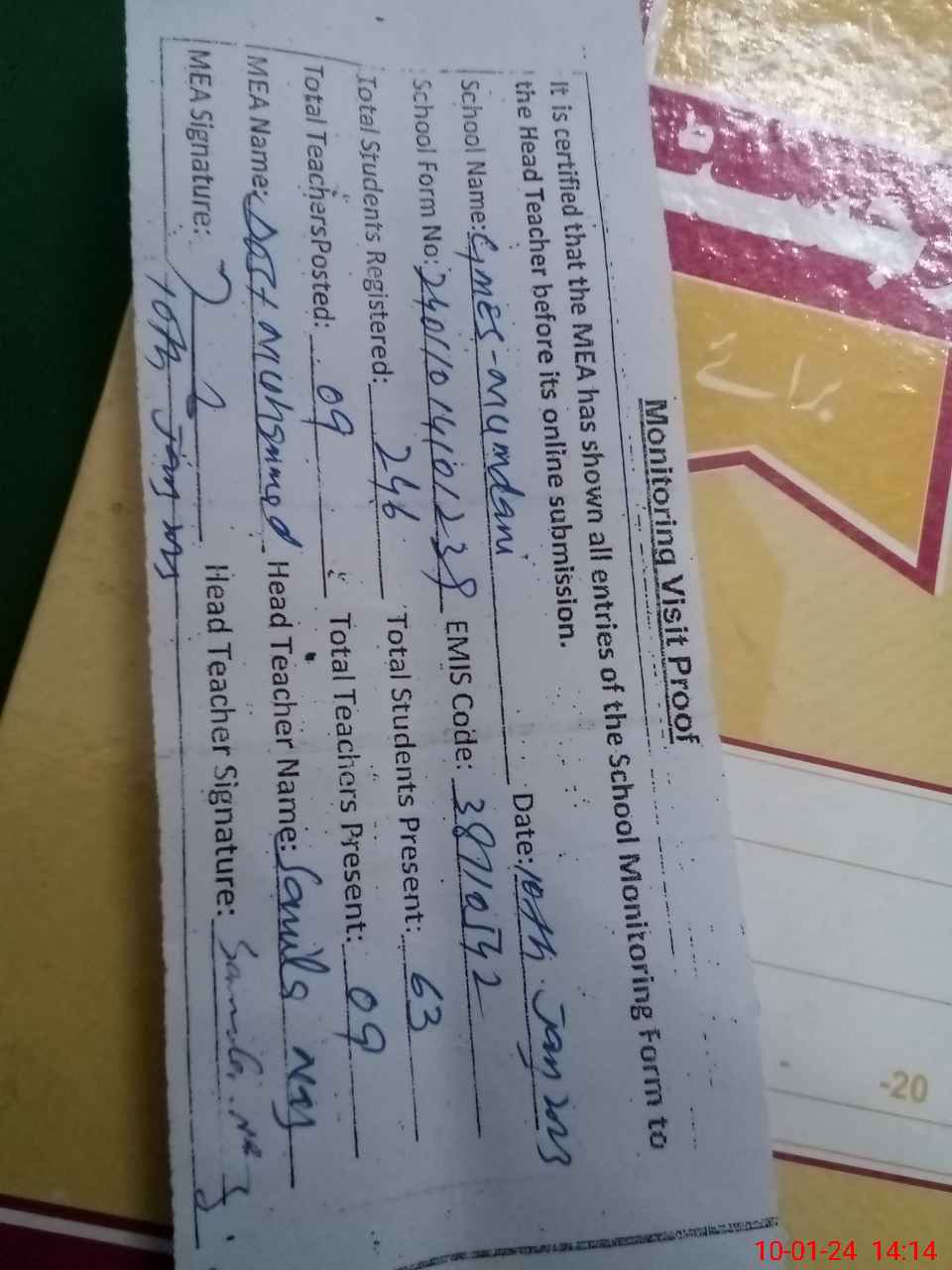 | Certified that this School was Inspected by the Undersigned MEA/DMO Today and the Information Stated Above is as Per Record. | |||||