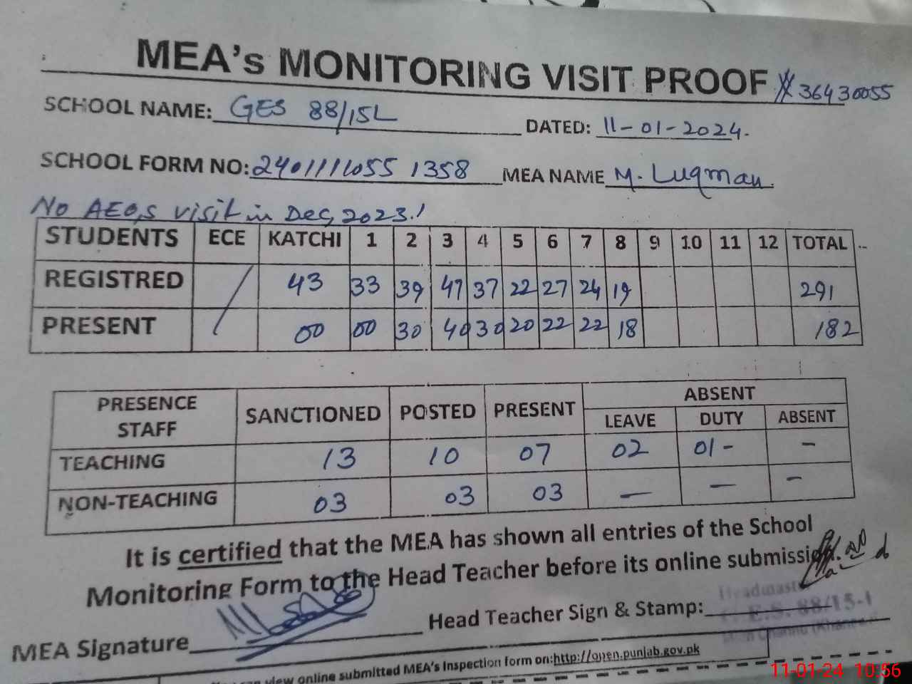 | Certified that this School was Inspected by the Undersigned MEA/DMO Today and the Information Stated Above is as Per Record. | |||||