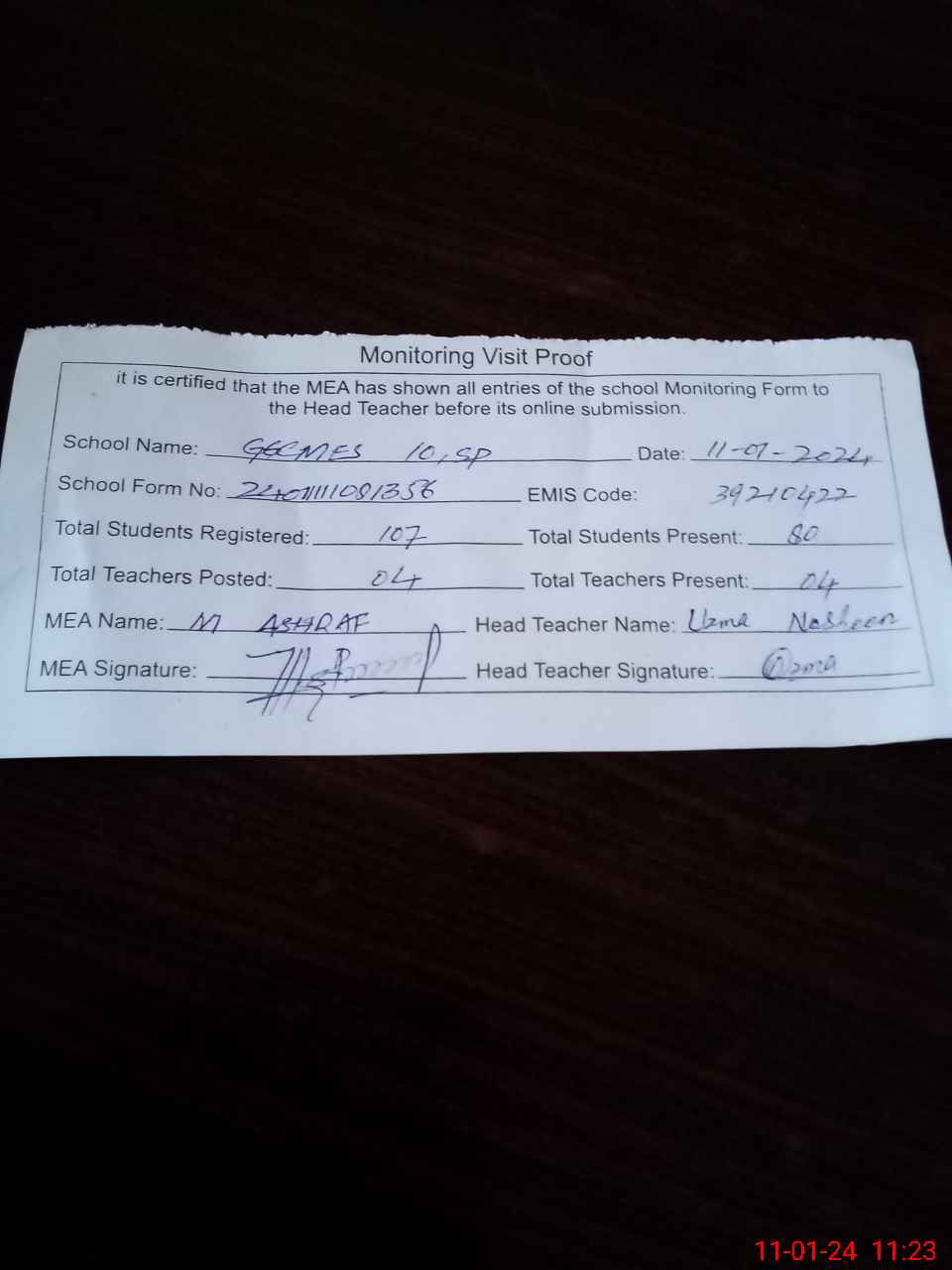 | Attendance Register | Head Teacher | MEA with School | Visit Proof |