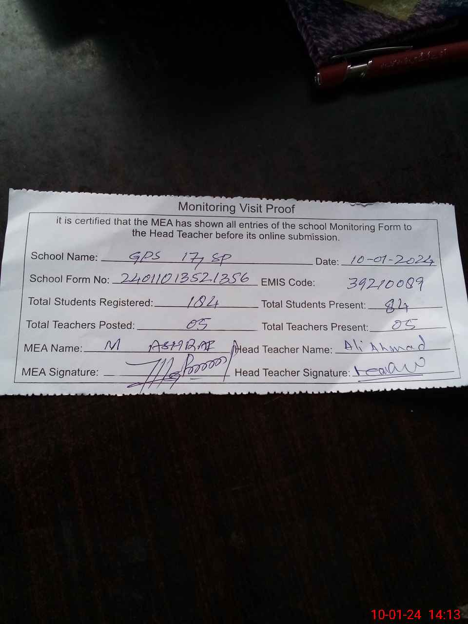 | Attendance Register | Head Teacher | MEA with School | Visit Proof |