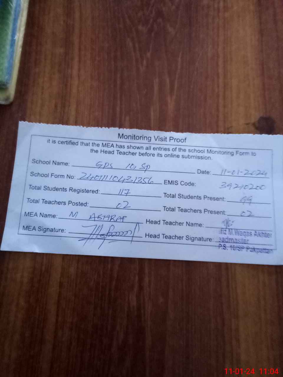 | EMIS Code: 39210200 | Name of School: GPS 10 SP PAKPATTAN | |||