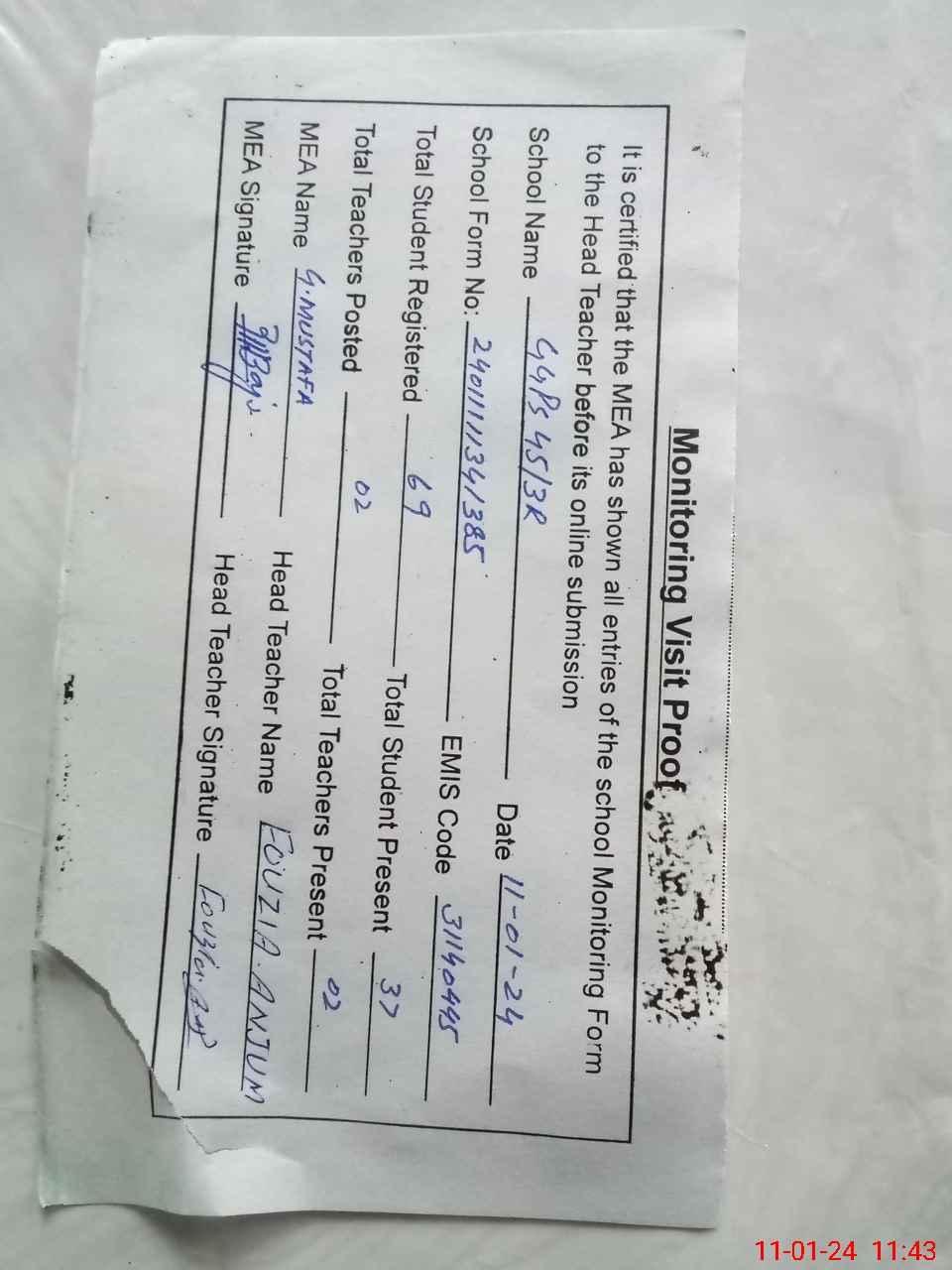 | Attendance Register | Head Teacher | MEA with School | Visit Proof |
