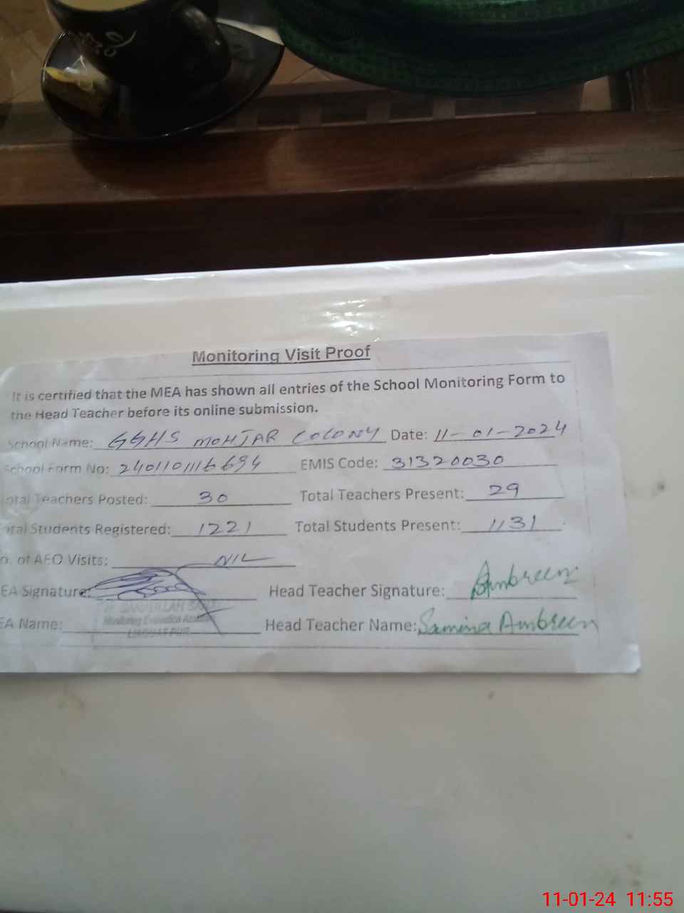 | Monitoring Date: 11-01-2024 | Start Time: 11-01-2024 11:15 AM | End Time: 11-01-2024 11:56 AM | Name of MEA: Mu**** Sa**** Ul**** Sa**** | |