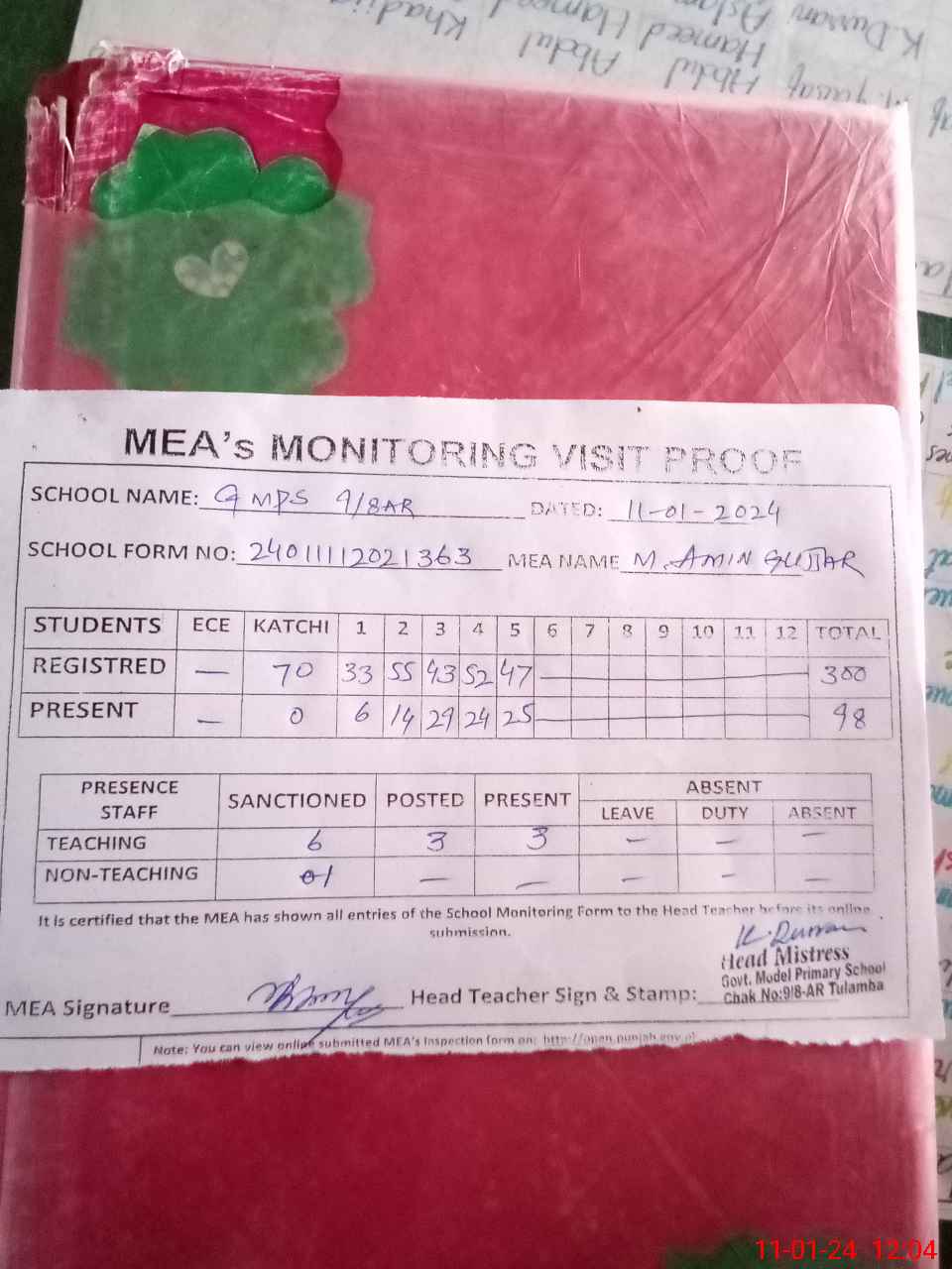 | Attendance Register | Head Teacher | MEA with School | Visit Proof |