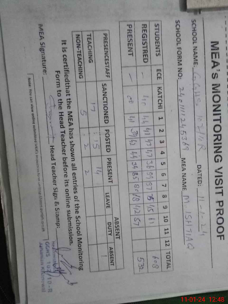 | Monitoring Date: 11-01-2024 | Start Time: 11-01-2024 12:05 PM | End Time: 11-01-2024 12:51 PM | Name of MEA: M.Is**** (S**** 03**** | |
