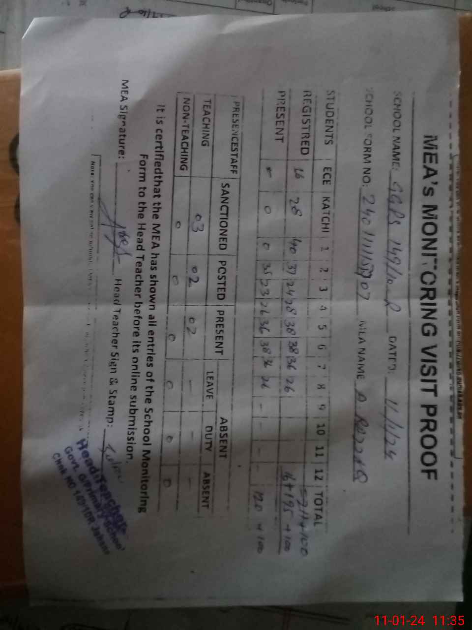 | Attendance Register | Head Teacher | MEA with School | Visit Proof |