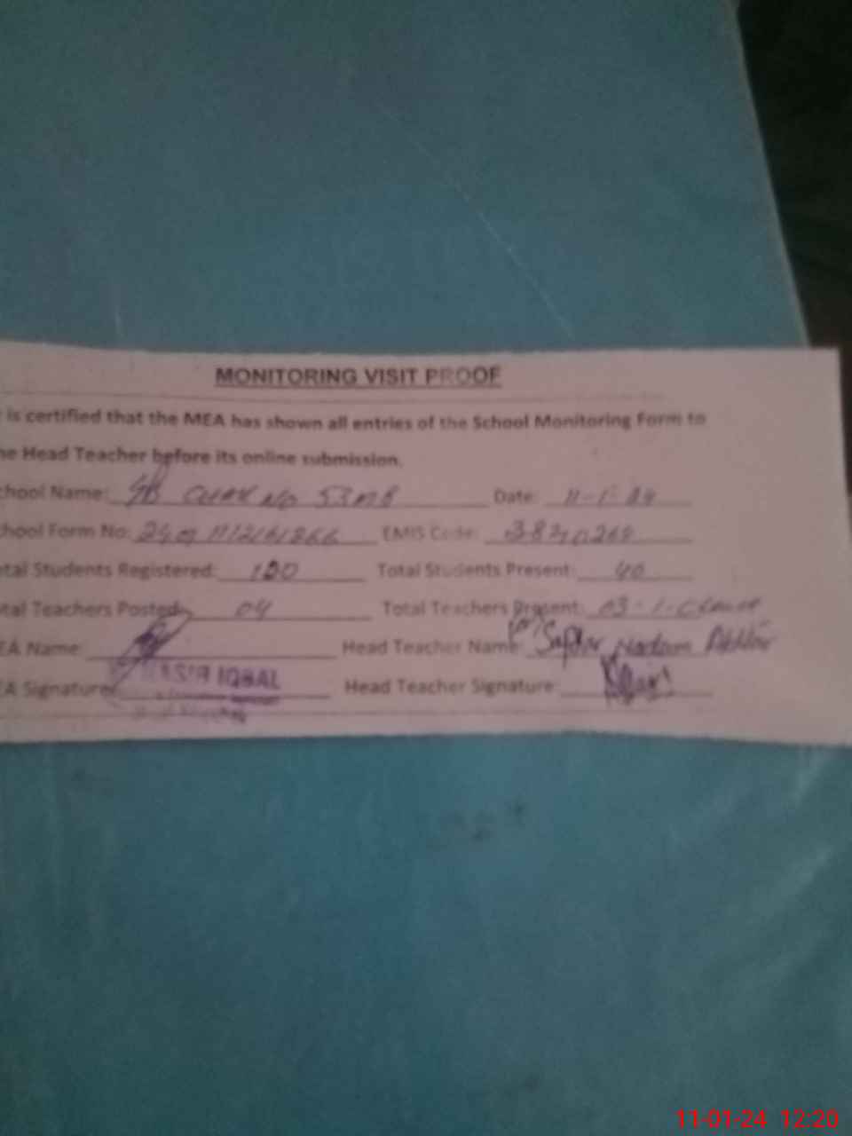 | Attendance Register | Head Teacher | MEA with School | Visit Proof |