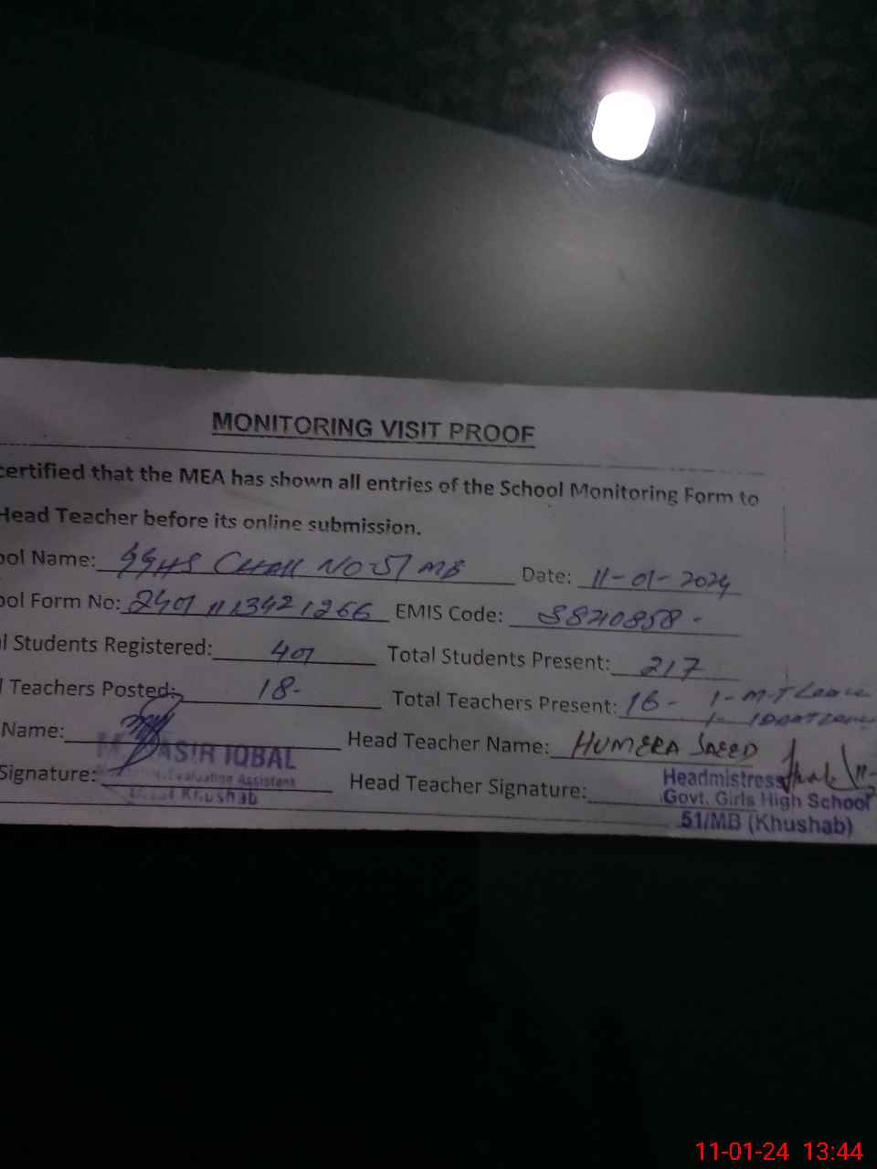| Certified that this School was Inspected by the Undersigned MEA/DMO Today and the Information Stated Above is as Per Record. | |||||