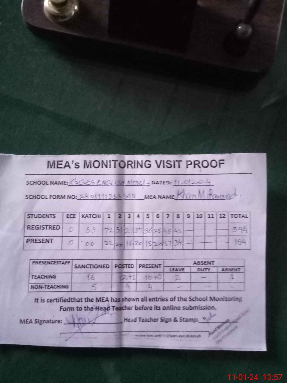 | Attendance Register | Head Teacher | MEA with School | Visit Proof |
