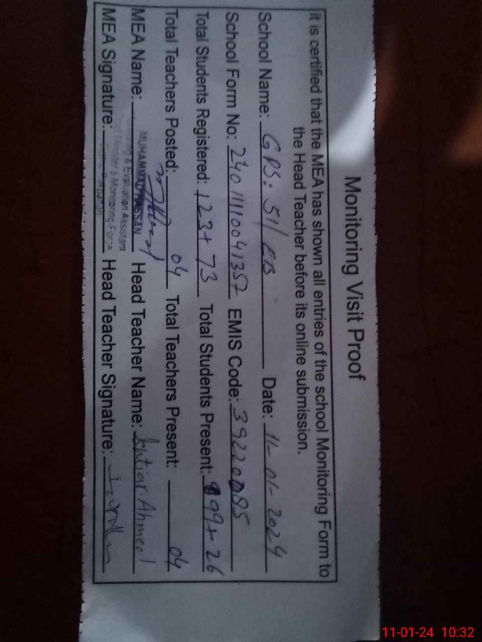 | Attendance Register | Head Teacher | MEA with School | Visit Proof |