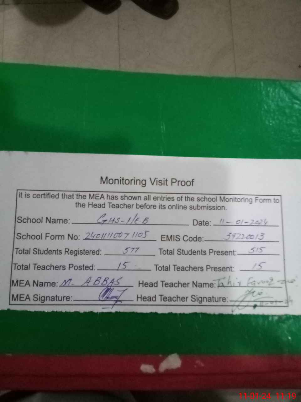| Attendance Register | Head Teacher | MEA with School | Visit Proof |