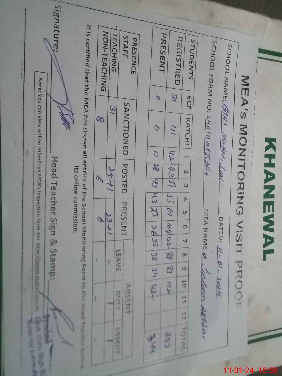 | Attendance Register | Head Teacher | MEA with School | Visit Proof |