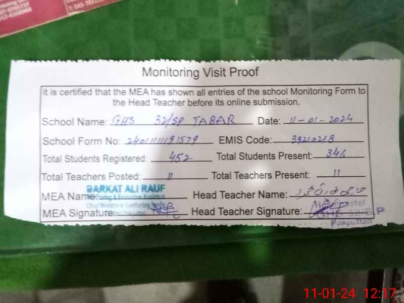 | Attendance Register | Head Teacher | MEA with School | Visit Proof |