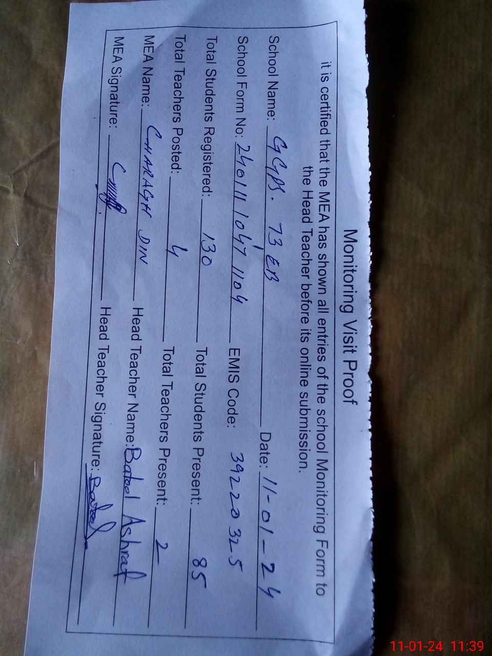 | Attendance Register | Head Teacher | MEA with School | Visit Proof |