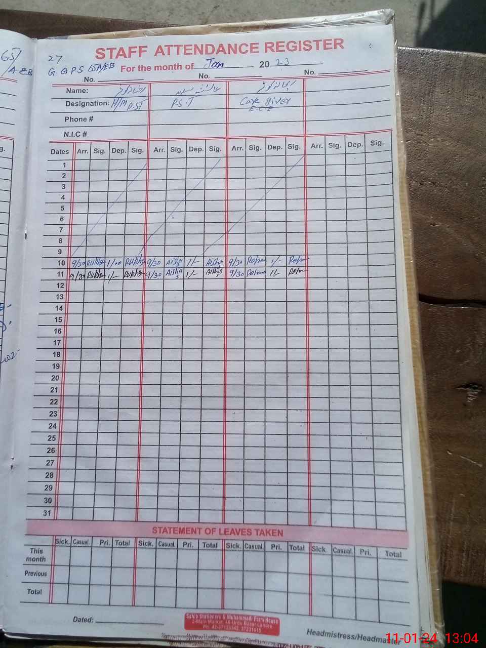 | CNIC | Full Name | Designation | R/C | Absence During Last Calender Month |