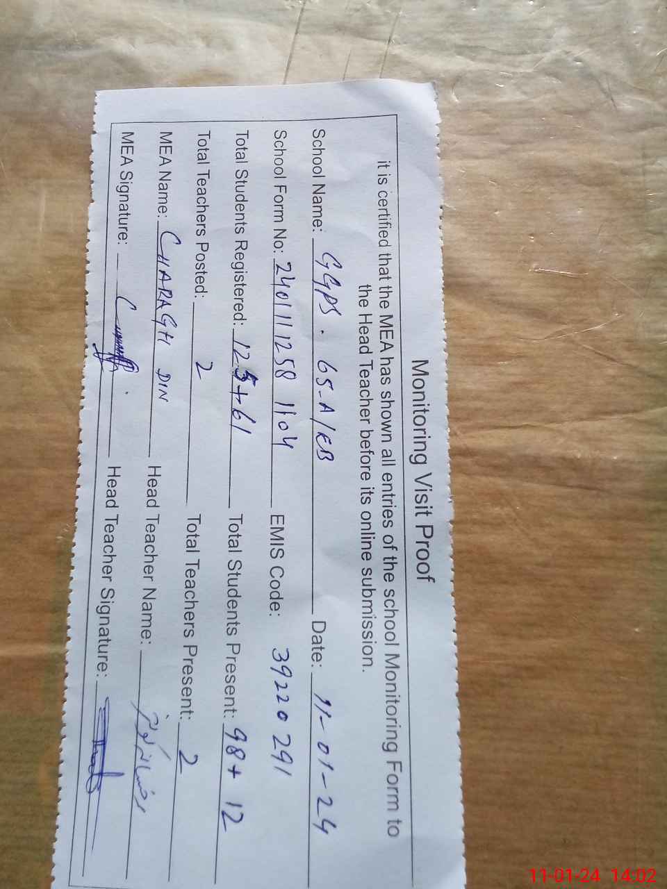 | Attendance Register | Head Teacher | MEA with School | Visit Proof |
