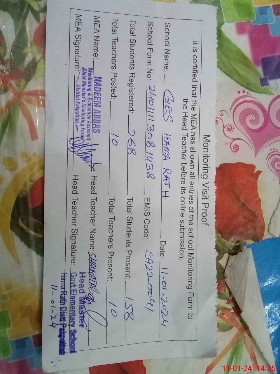 | Certified that this School was Inspected by the Undersigned MEA/DMO Today and the Information Stated Above is as Per Record. | |||||