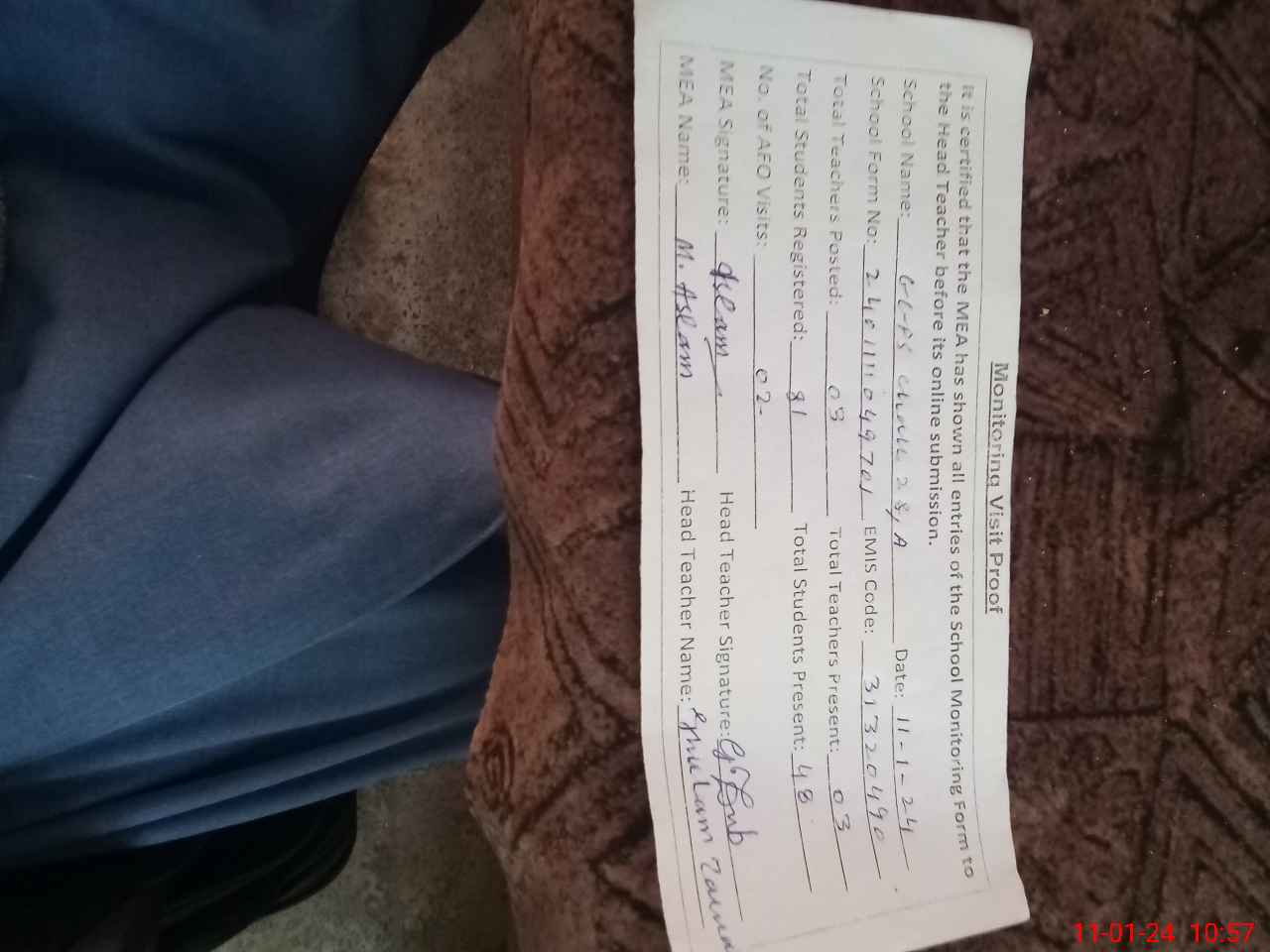 | Attendance Register | Head Teacher | MEA with School | Visit Proof |