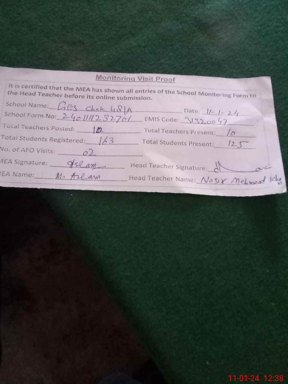| Attendance Register | Head Teacher | MEA with School | Visit Proof |