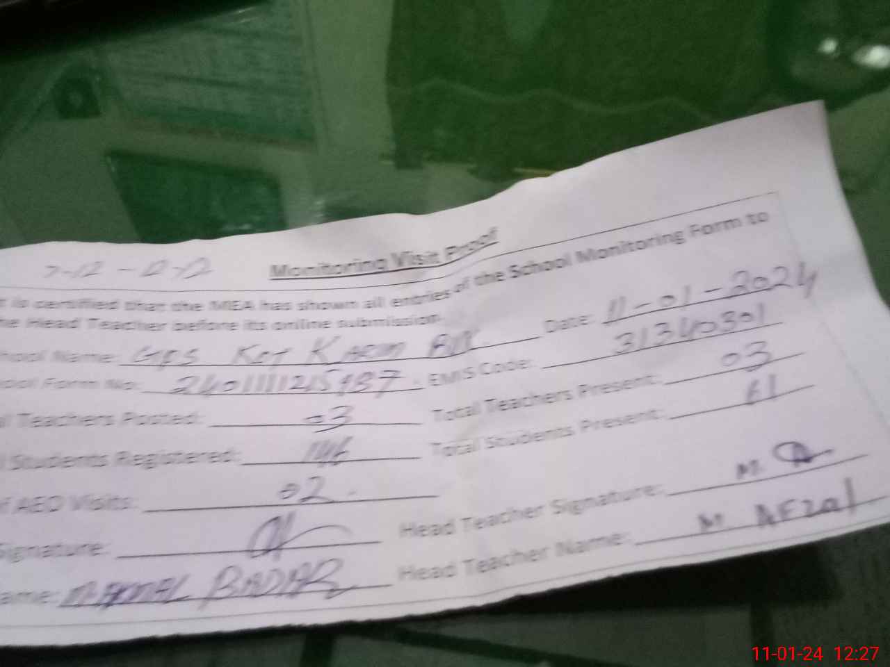 | Attendance Register | Head Teacher | MEA with School | Visit Proof |