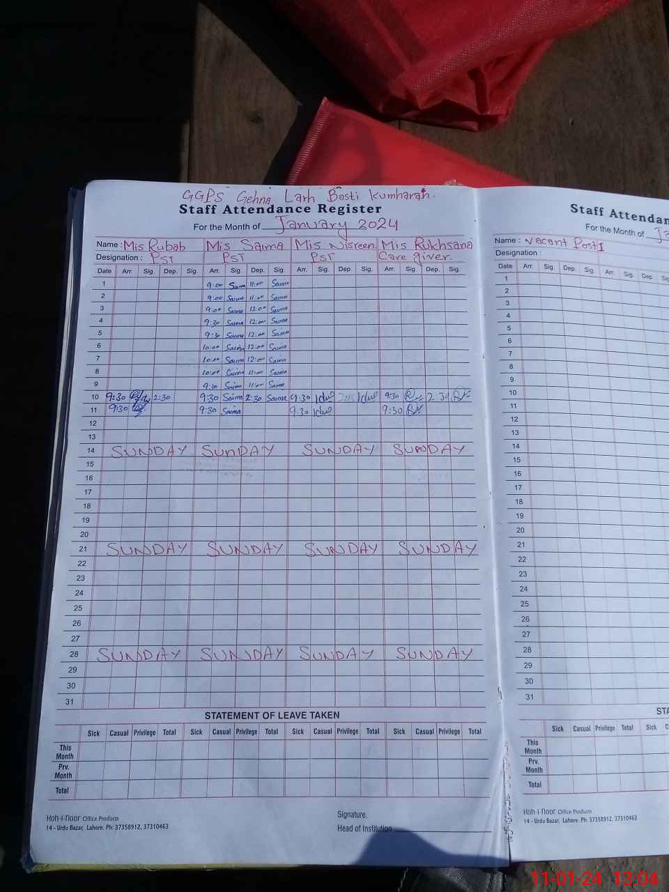 | Leave | Duty | Absent | Maternity | Medical | Ex- Pak |