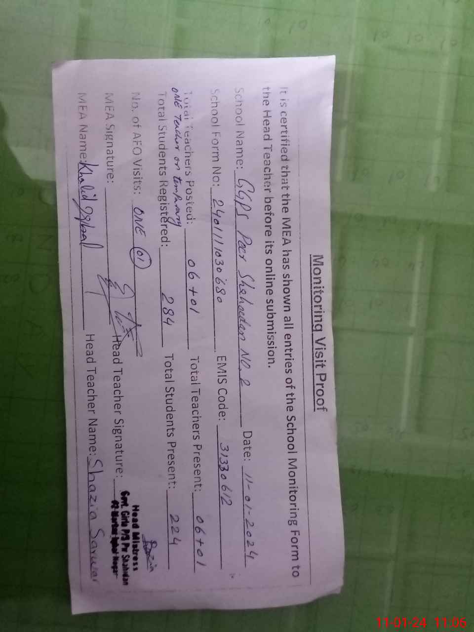 | Attendance Register | Head Teacher | MEA with School | Visit Proof |