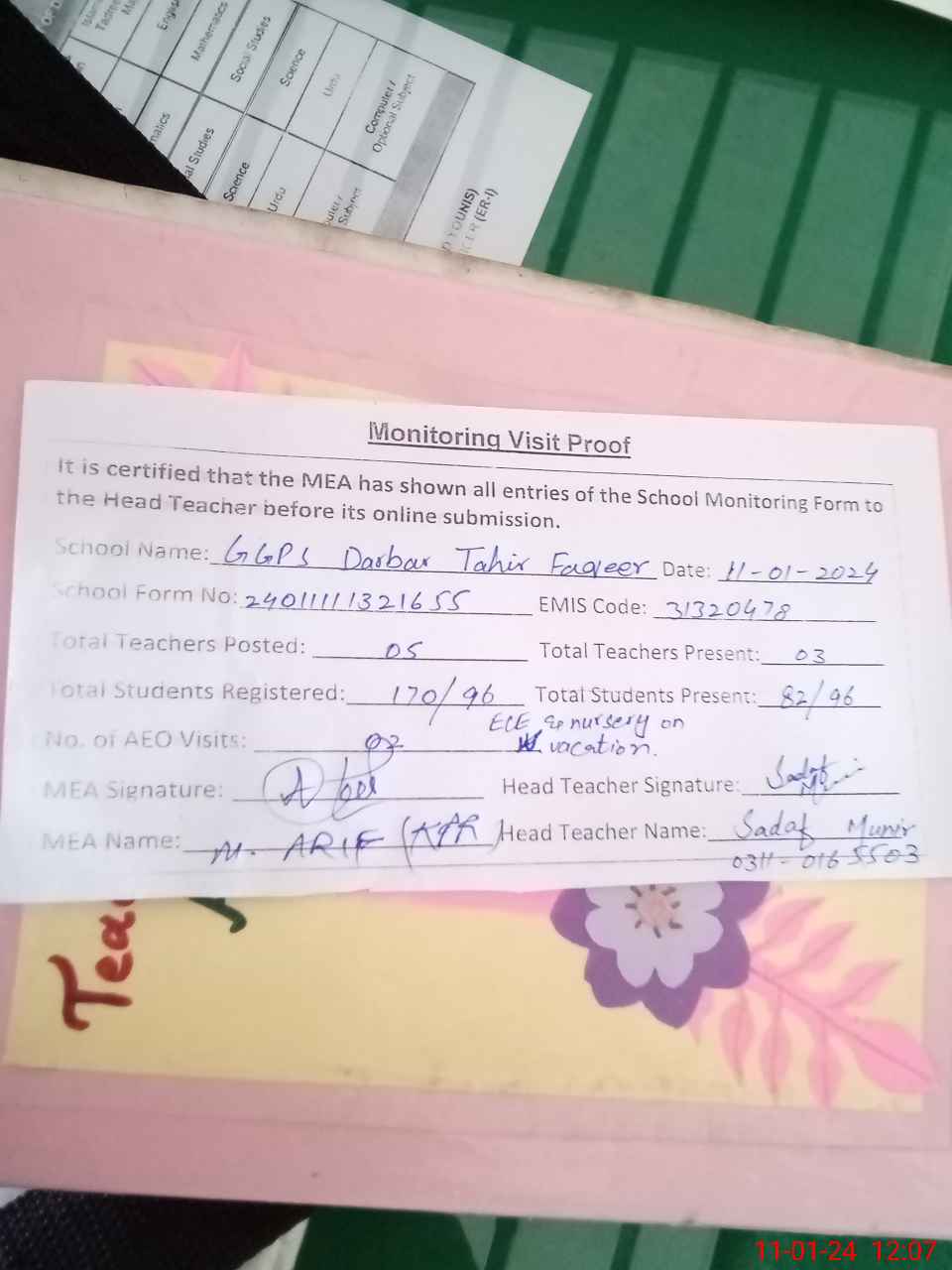 | Attendance Register | Head Teacher | MEA with School | Visit Proof |