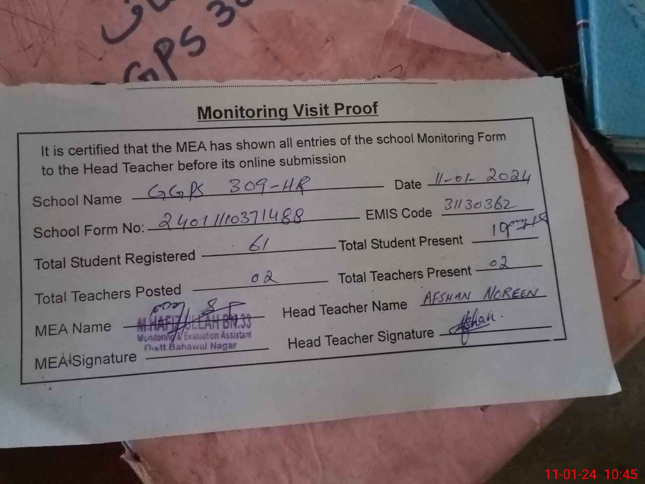 | Attendance Register | Head Teacher | MEA with School | Visit Proof |