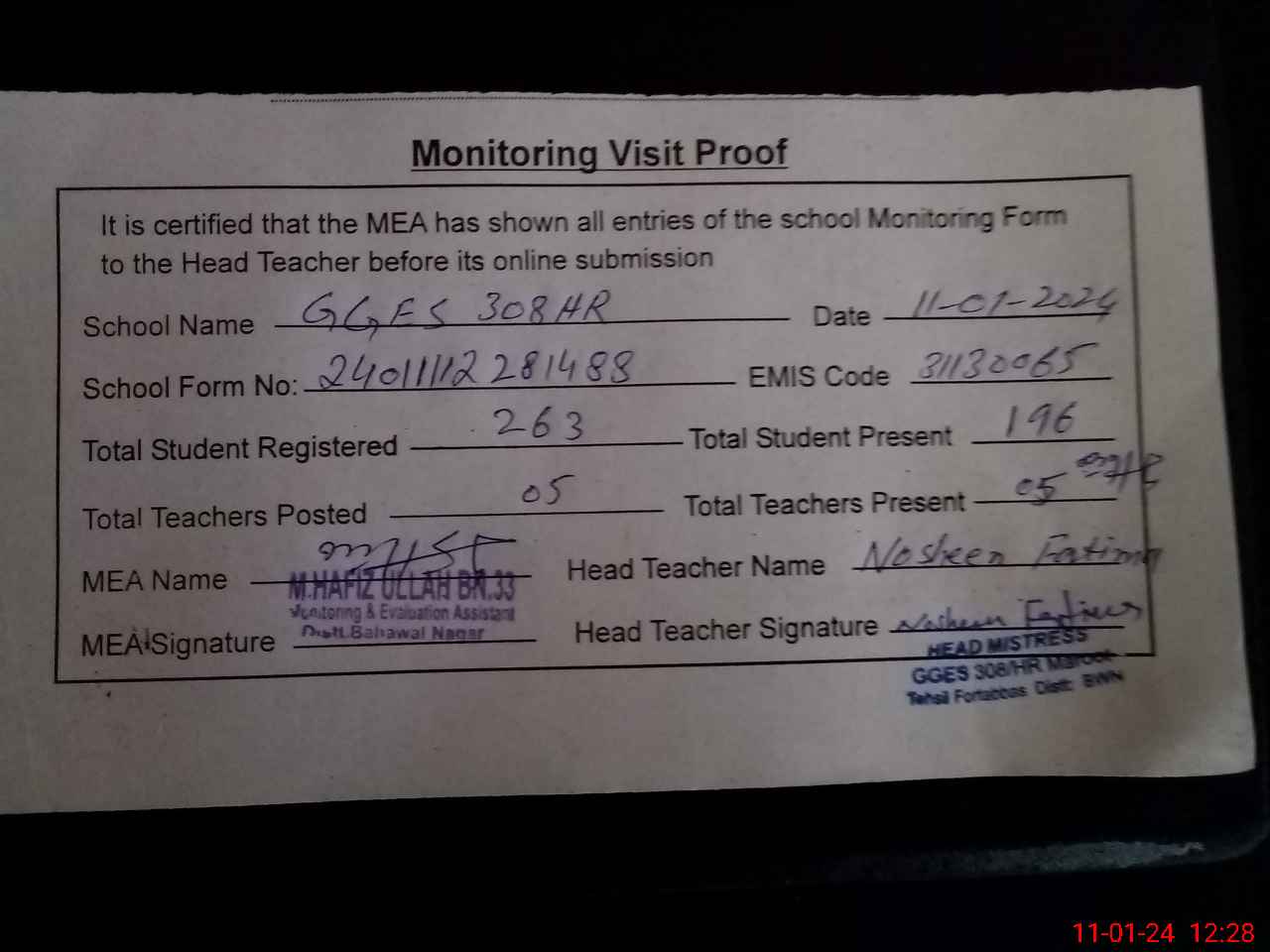 | Attendance Register | Head Teacher | MEA with School | Visit Proof |
