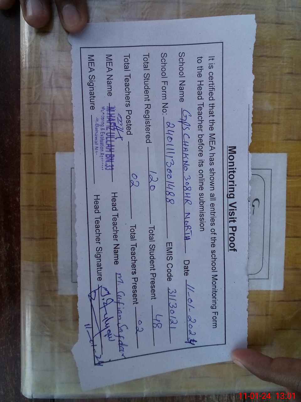 | Attendance Register | Head Teacher | MEA with School | Visit Proof |