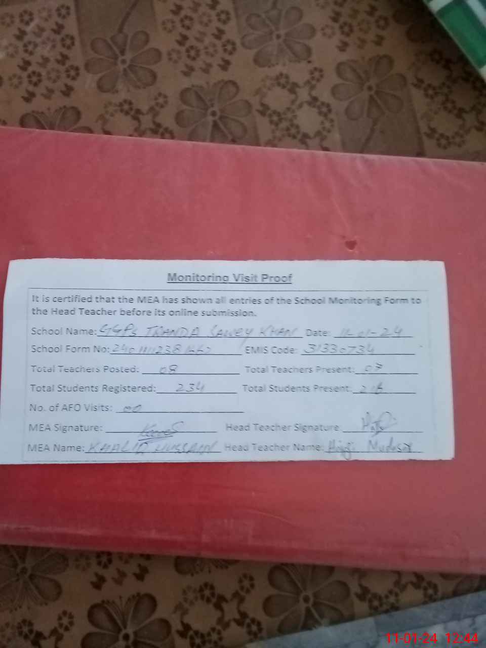 | Attendance Register | Head Teacher | MEA with School | Visit Proof |