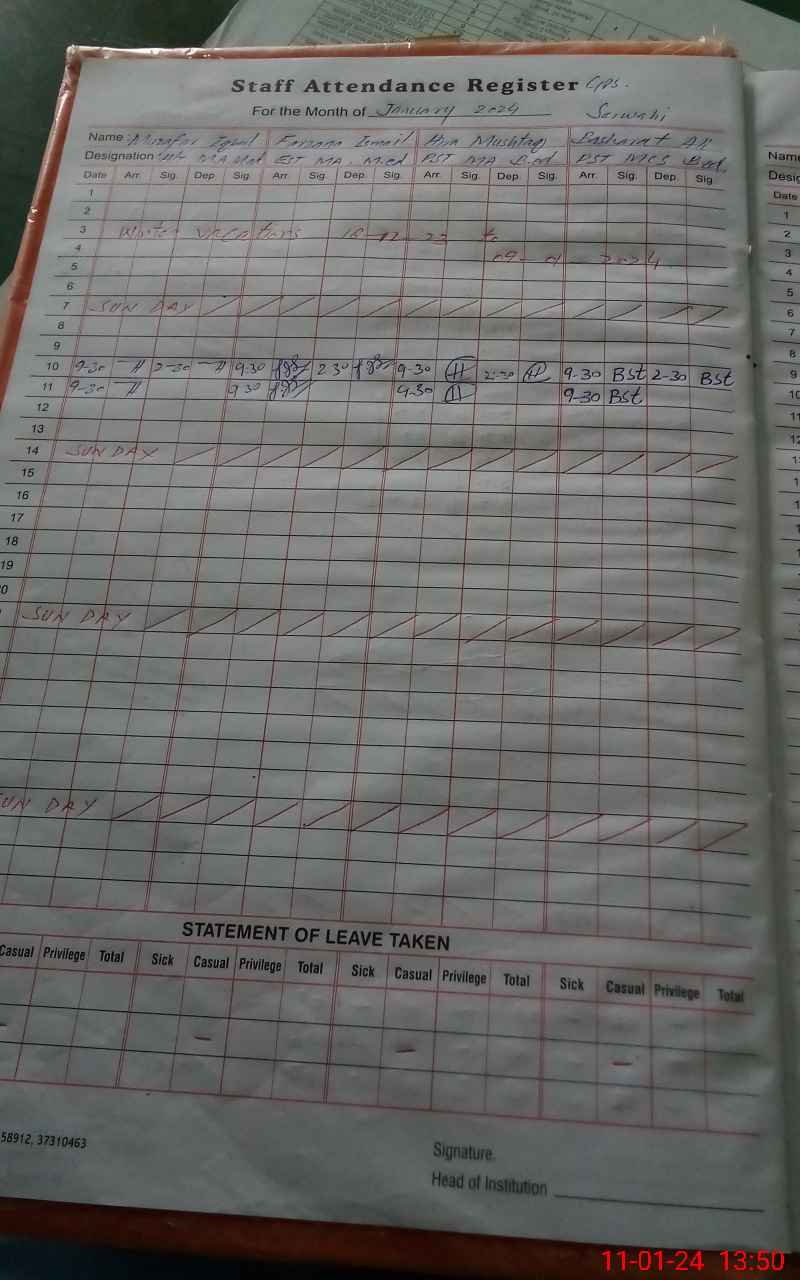| Remarks (Use Separate Page if Required): Prep and nursery classes are on winter vacation | |||||