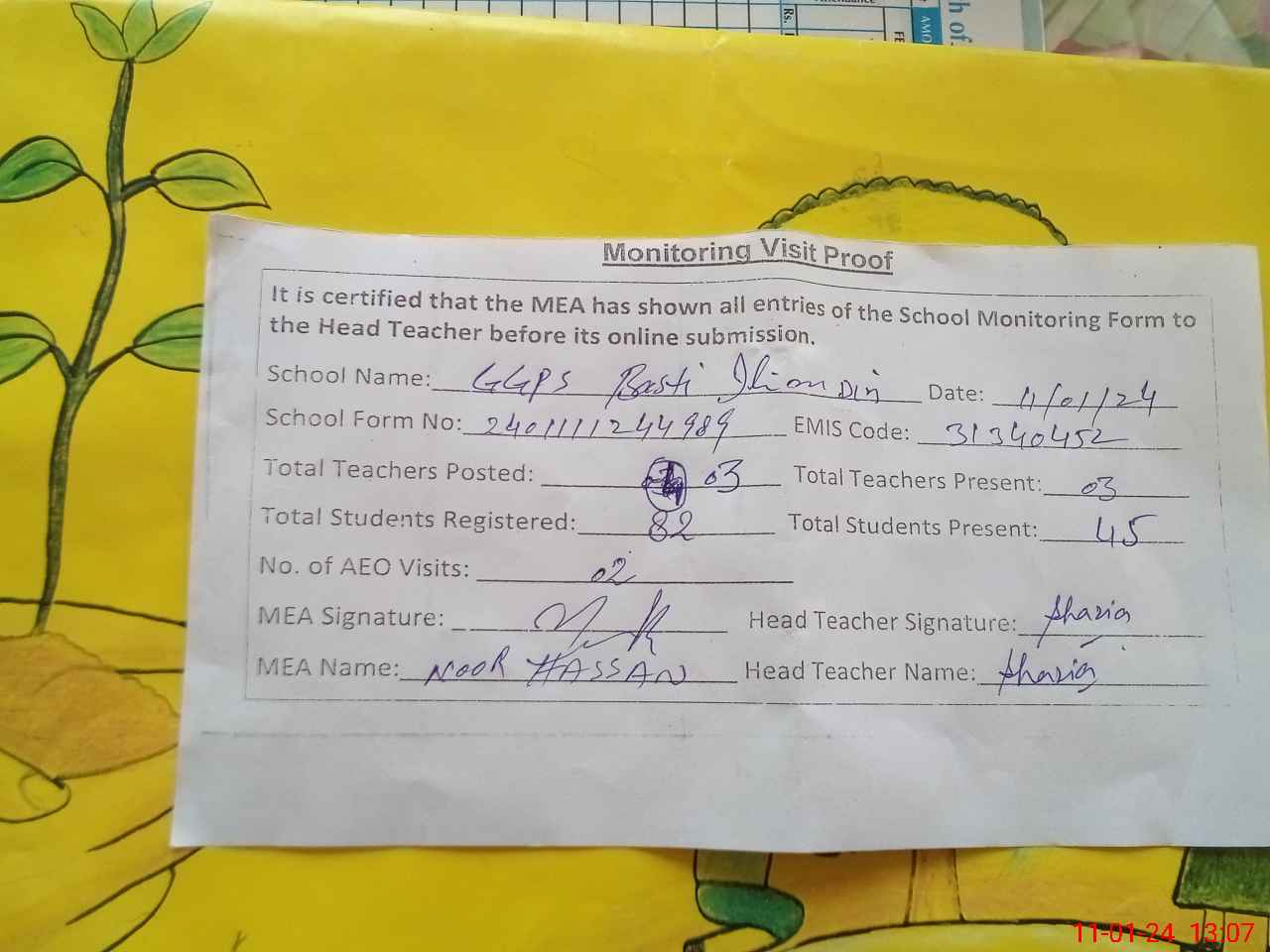 | Attendance Register | Head Teacher | MEA with School | Visit Proof |