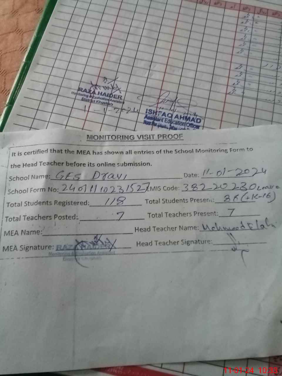 | Attendance Register | Head Teacher | MEA with School | Visit Proof |