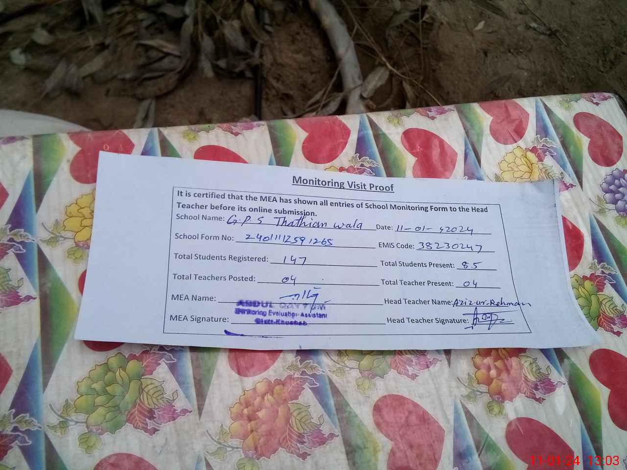 | Attendance Register | Head Teacher | MEA with School | Visit Proof |
