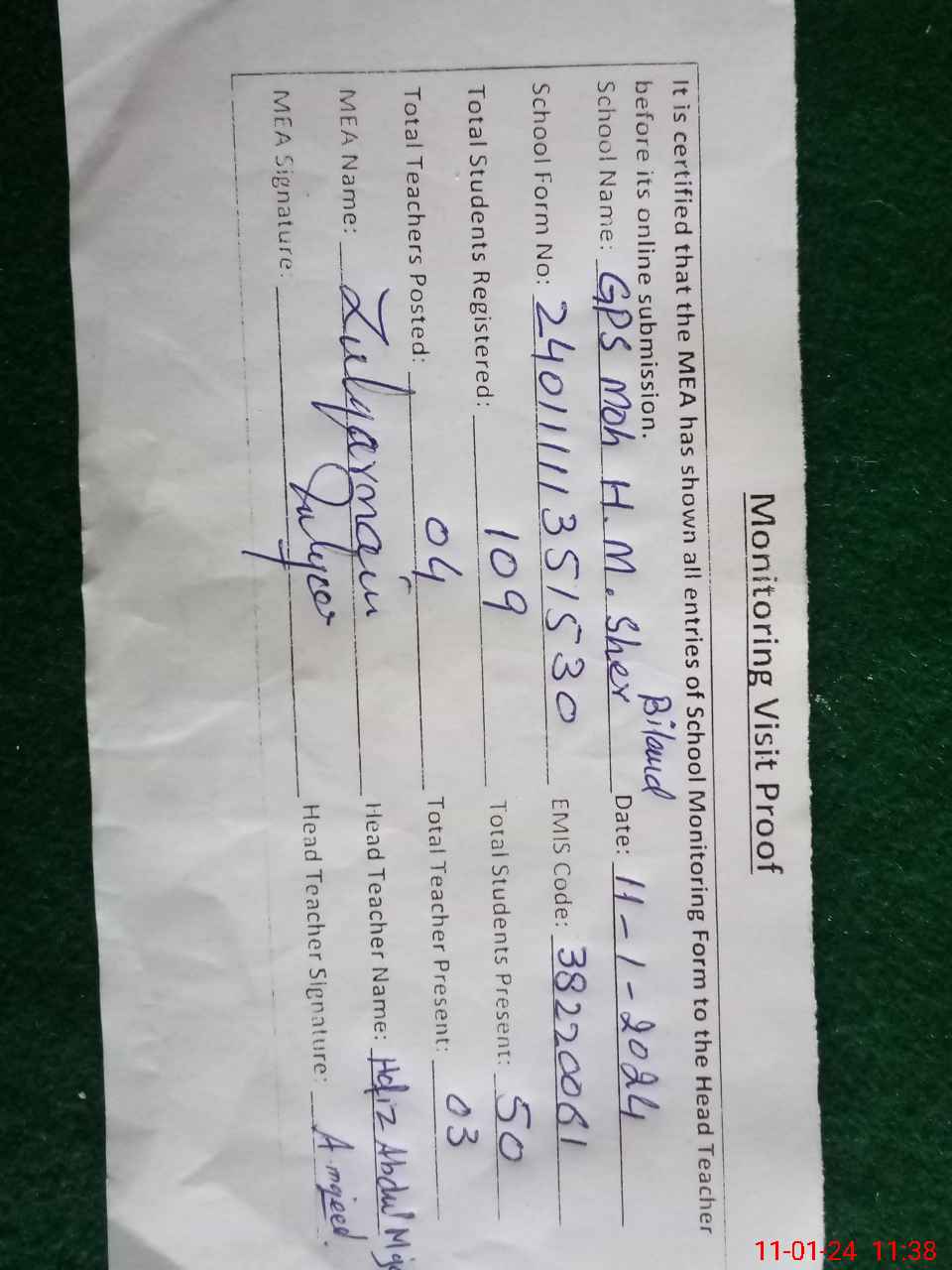 | EMIS Code: 38220061 | Name of School: GPS MOHALLA HAJI MUHAMMAD SHER BILAND | |||
