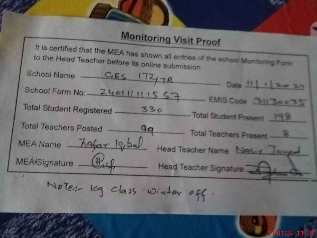 | Attendance Register | Head Teacher | MEA with School | Visit Proof |