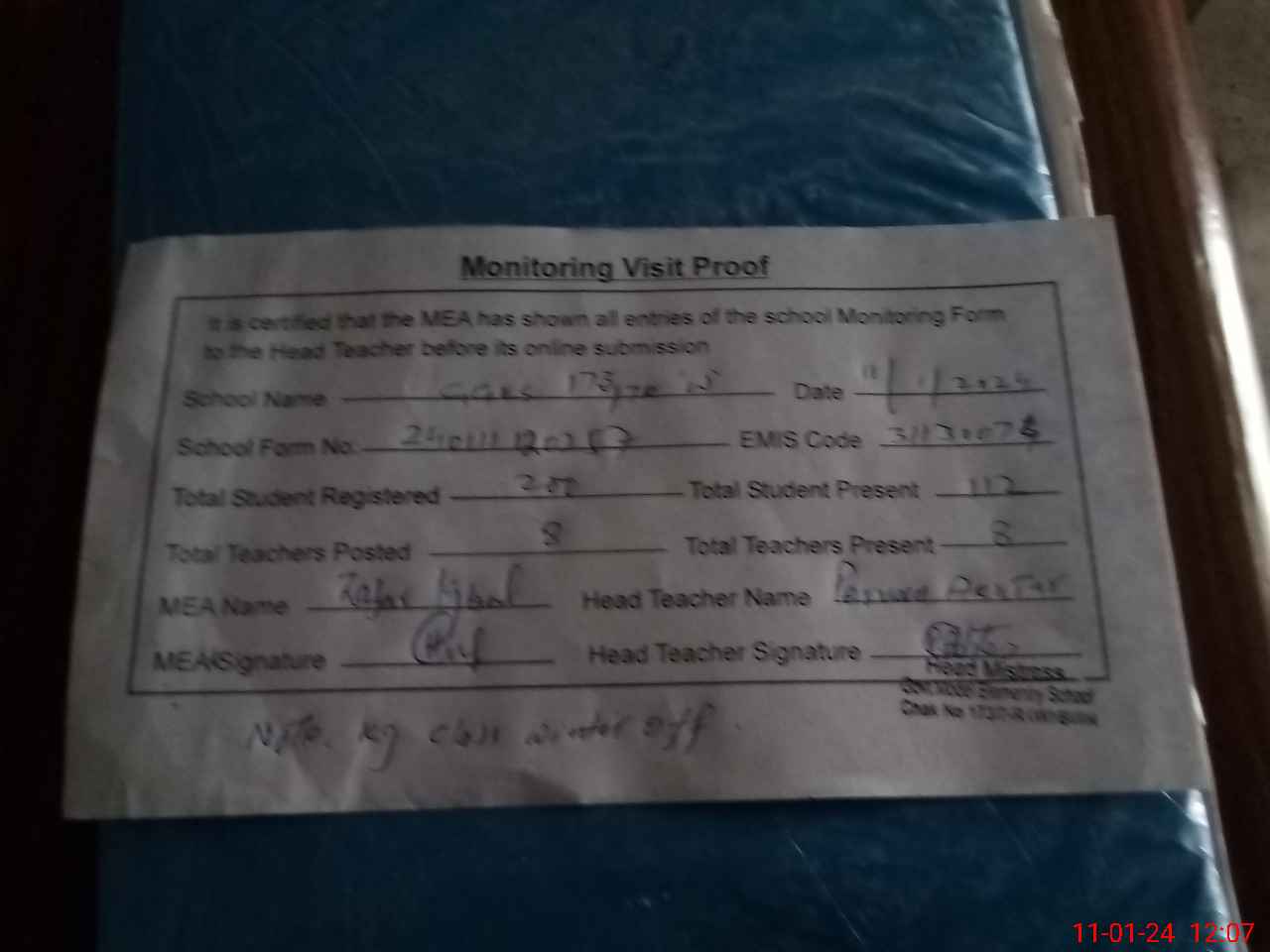 | Attendance Register | Head Teacher | MEA with School | Visit Proof |