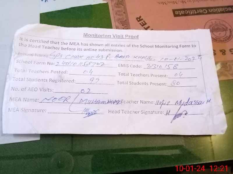 | EMIS Code: 31310158 | Name of School: GPS CHAK NO 43/P BASTI KHALIL | |||