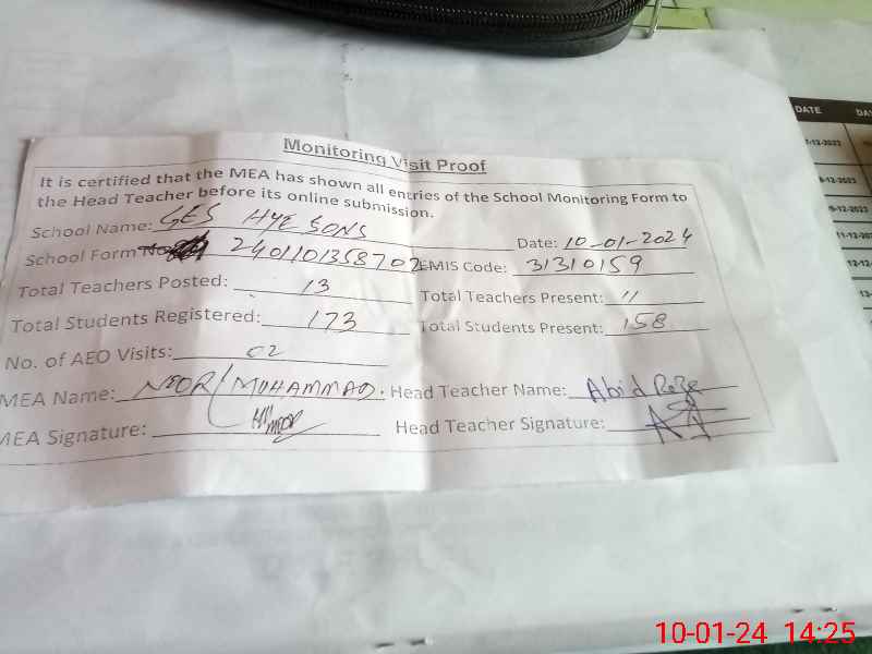 | Attendance Register | Head Teacher | MEA with School | Visit Proof |