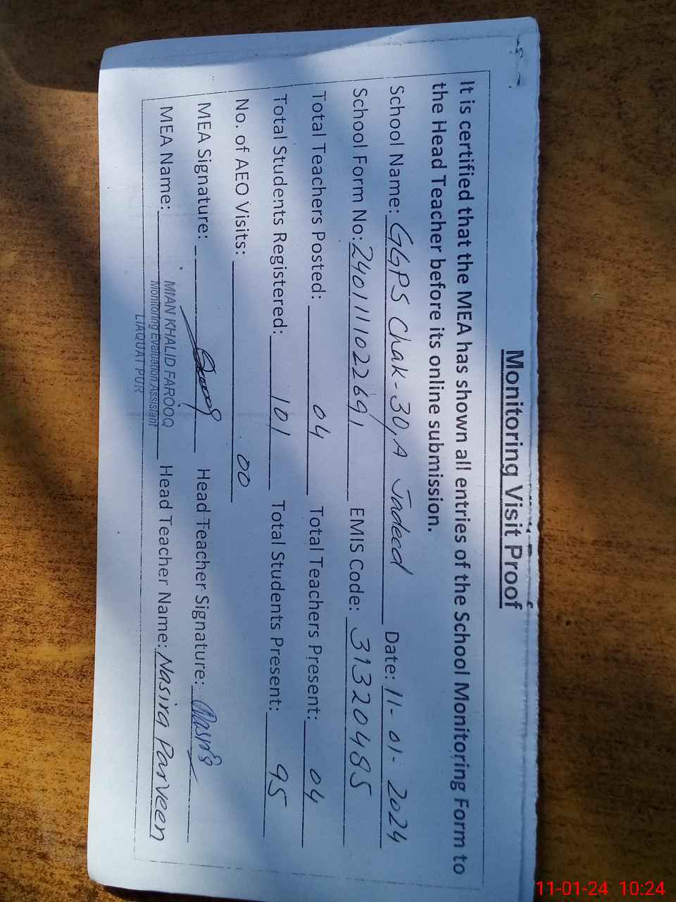 | EMIS Code: 31320485 | Name of School: GGPS CHAK NO.30/A JADEED | |||