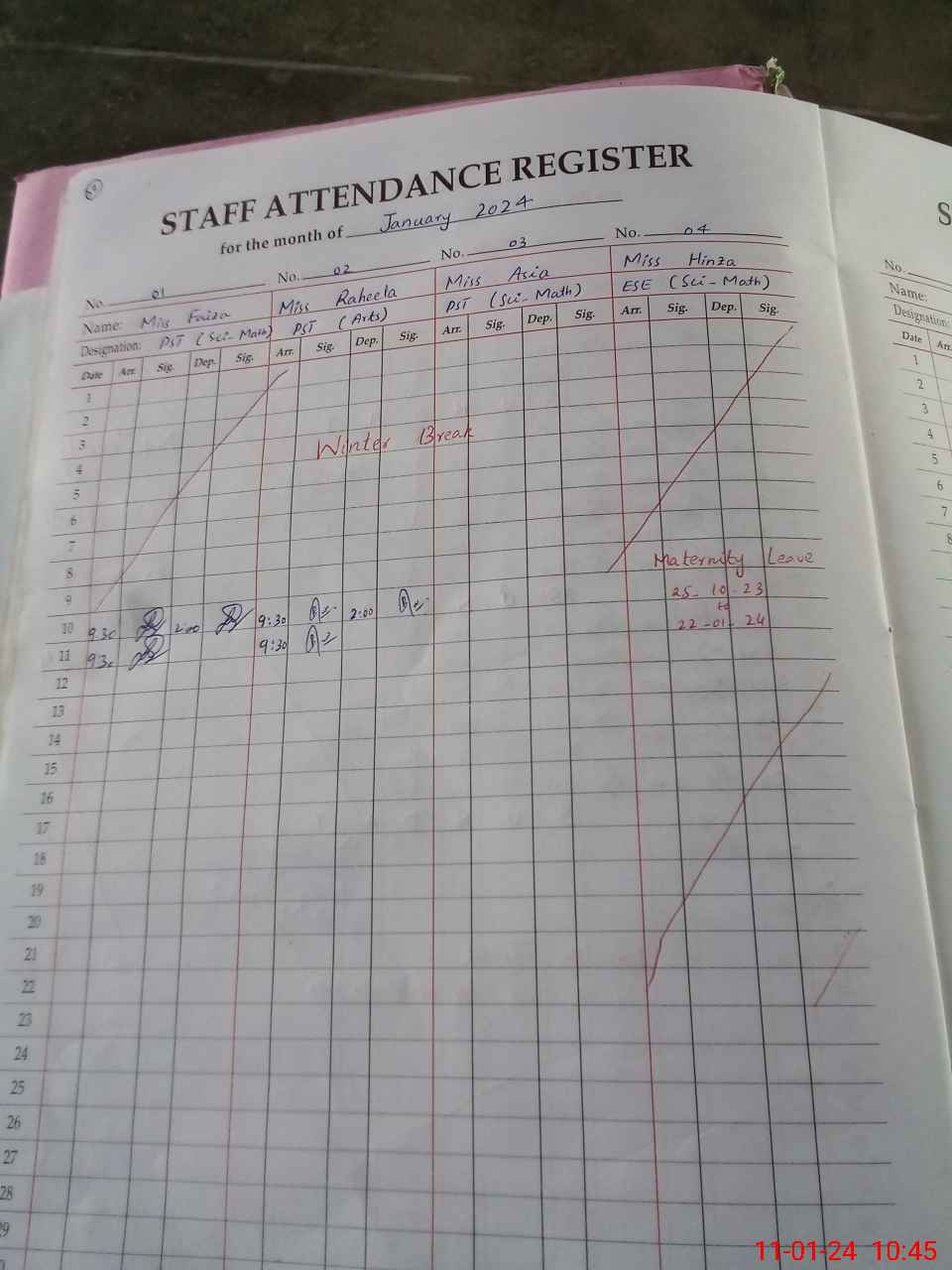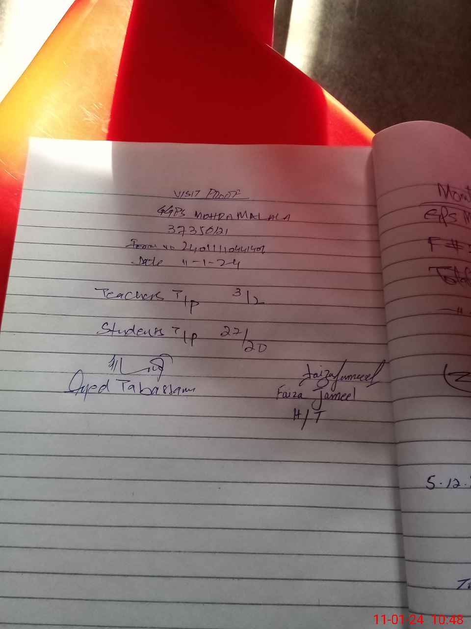 | Remarks (Use Separate Page if Required): Teacher Hinza Hafeez Ese not tage on sis she is on Met leave | |||||
